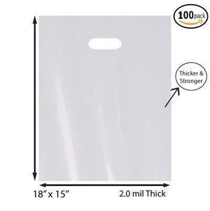 Pack of 100 White Glossy Bags Die Cut Handles, Measures: 16" x 18" with 2 Thickness Weights & DimensionsW 16" X H 18" By 2 Mil Thick, 4.5 lbs. 💯 Pack of 100 White Glossy Bags Die Cut Handles, Measures:...