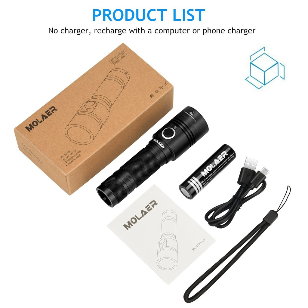 Rechargeable Flashlight, MOLAER Super Bright LED Tactical Waterproof Torch, 1000 High Lumens 4 Light Modes for Camping, Hiking and Emergency