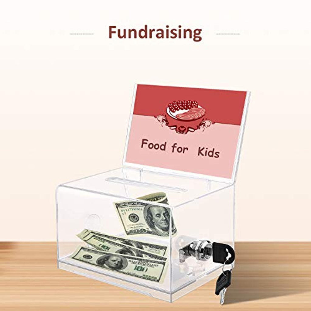 - ACRYLIC DONATION BOX WITH LOCK AND MESSAGE DISPLAY: SBB-66 is another useful office accessory from Clear-Ad. It is a clear standing donation box similar to donation jar that can be used as a money collection box. These plexiglass donation boxes for fundraising and charities are lockable and come with a 8.5x11" message display stand and a lock with keys.