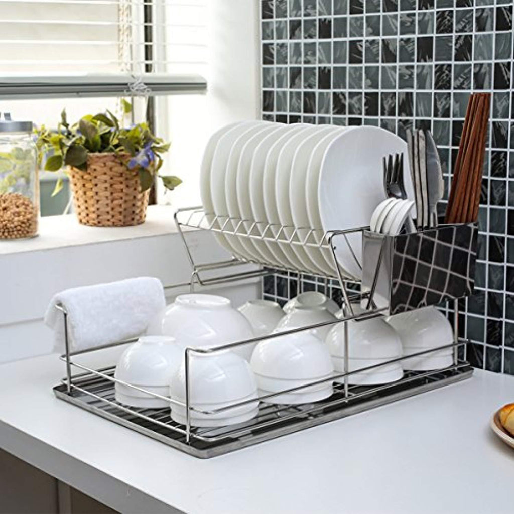 1208S 2 Tier Dish Drainer Dish Rack with Removable Utensil Cup for Kitchen Counter, Stainless Steel