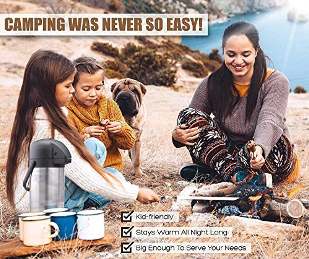 • DISPENSES EASILY AND QUICKLY - with the pump-action top. Just press down on the button at top and the beverage pours out. You can fill up to 15 coffee cups with one simple press for each