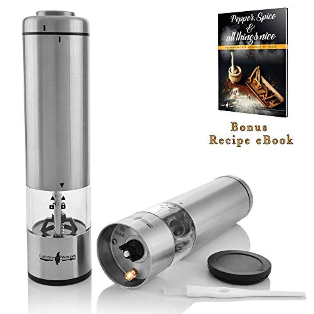 Battery operated Salt and Pepper Grinder set - 2 Electric pepper mill grinders - Stainless Steel - Carry Stand - LED light - Adjustable Coarseness - Automatic salt n pepper shakers by Culinary Wizards