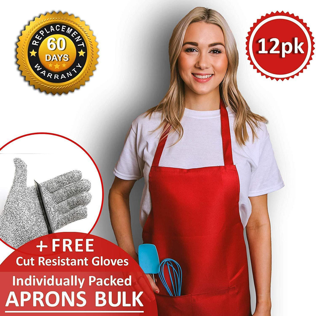 CHEFLUX [12pk] Premium Professional Red Restaurant Aprons with 2 Large Pockets [Bulk] Chef Cooking Bib Apron for Kitchen Waitress [Unisex] Men Women [53 g Lightweight] BBQ Painting Stylist Artist