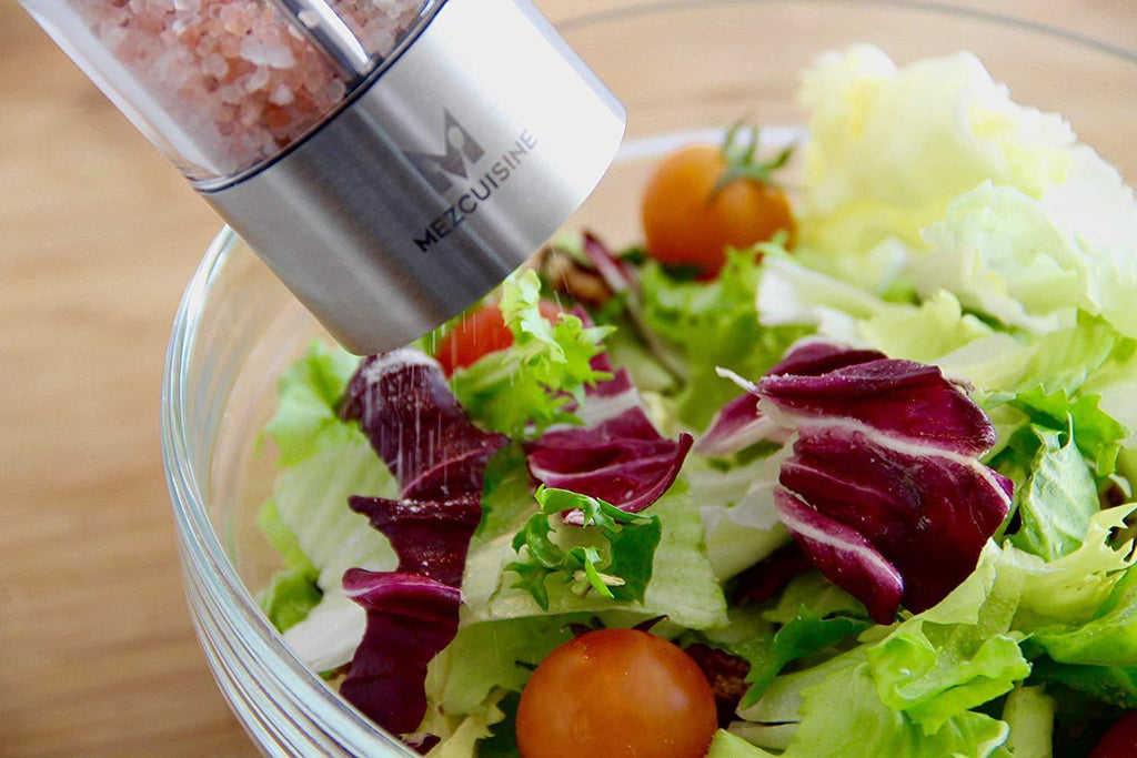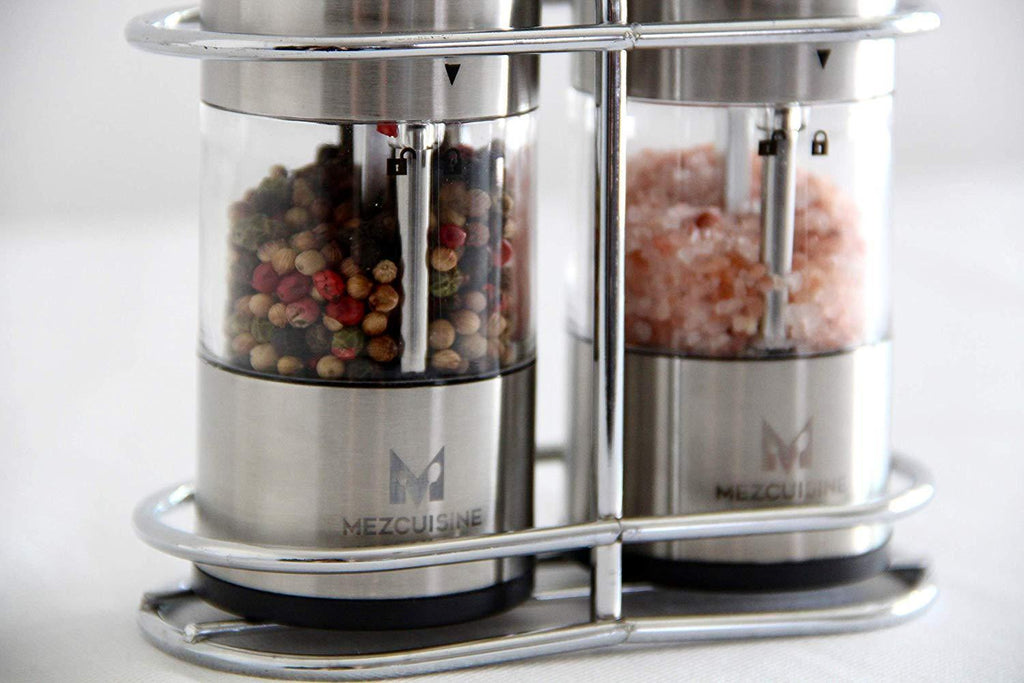 • EFFORTLESS BY PRESSING ONE BUTTON to grind any spice evenly saving you time | Its way faster when compared with old pepper grinders or shakers giving you all the flavour of minced spices | You will season your food like a pro when cooking with Mezcuisine Salt and Pepper Grinder Set feeling the fantastic ergonomic shape specially designed to make you a natural chef | Master the art of seasoning by controlling the multiple coarse sizes available to you