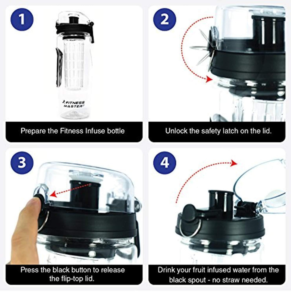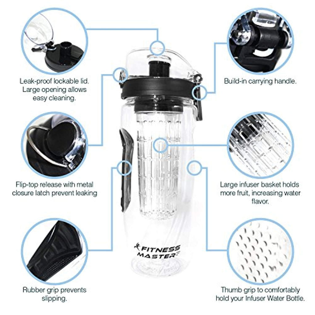 Fitness Master Fruit Infuser Water Bottle (32 Ounce) - BPA Free Plastic, Leak Proof, Lockable Lid and Rubber Grips on Infusion Bottles