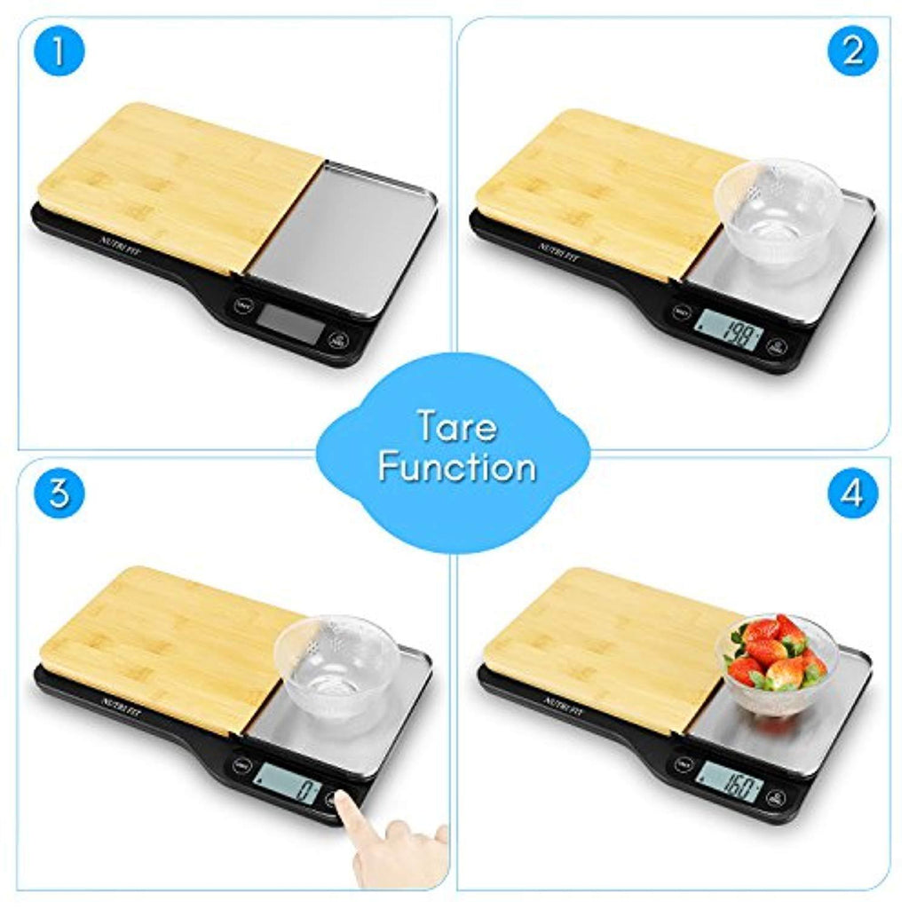Food Scale with Removable Bamboo Cutting Board & Tray-3 in 1 Digital Kitchen Scale, LCD Display, 11lb 5kg, Easy for Cooking & Clean by Nutrifit (Measuring spoons & Batteries Included)