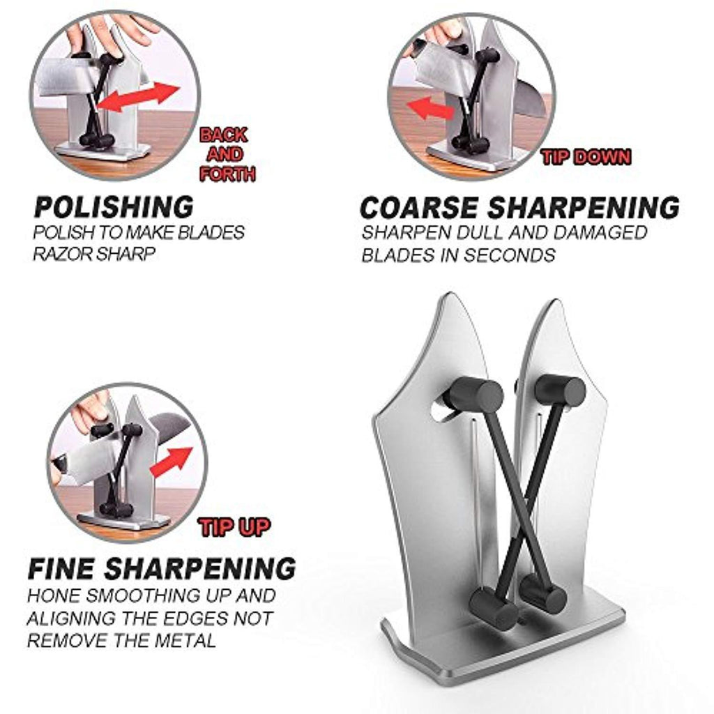• 【SHARPEN,HONE,POLISH VARIOUS KNIVES】- Two independent angle adjustable spring action arms make it easy to sharpen different kinds of knives,for example,Japanese single bevel blades,Chef's Knives, Pairing Knives and so on.