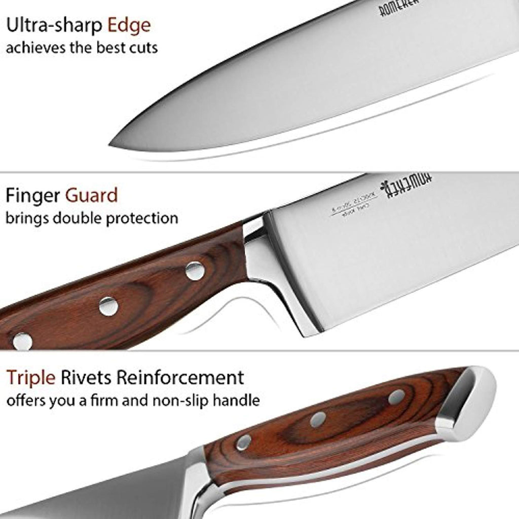 - 【WARRANTY】:We’re dedicated to enhance your cooking experience. Our aim: 100% satisfied customers. However,if you have any problem about the stainless steel knife set, please feel free to contact our Romeker customer service, we're always here for you.
