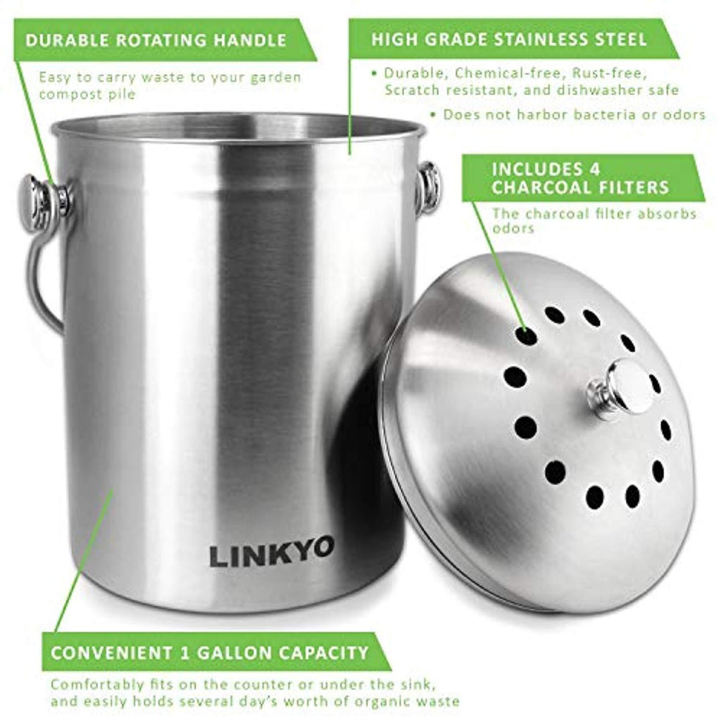 LINKYO Compost Bin - Stainless Steel Kitchen Composter, Includes 4 Filters (1 Gallon)