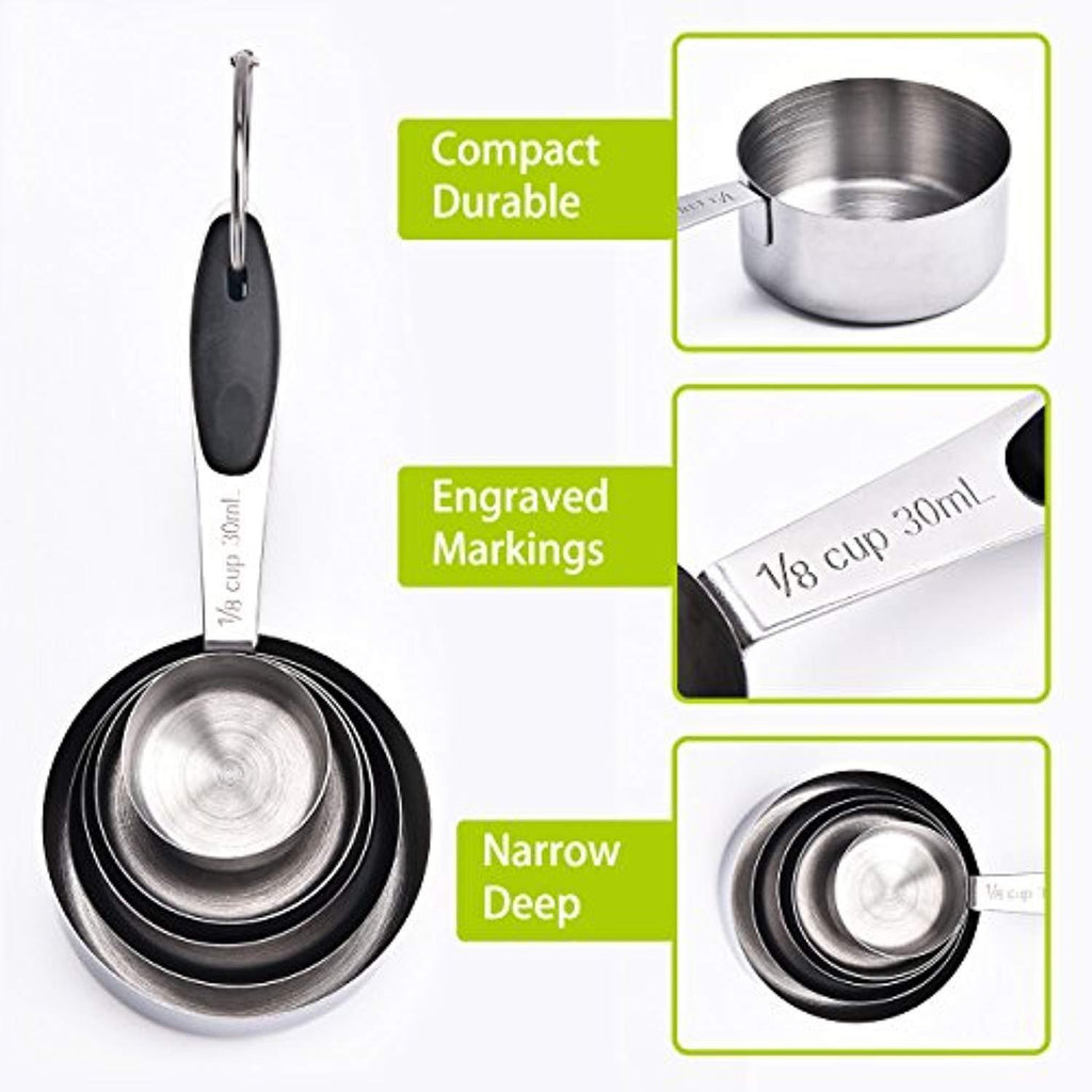 • 【PERFECT SPOONS/ CUPS FOR ACCRATE MEASURING】Crafted of professional-gauge tablespoons includes 11 measuring sizes: 1/8 tsp, 1/4 tsp, 1/2 tsp, 1 tsp, 1/2 Tbsp, 1-Tbsp, 1/8 cup, 1/4 cup, 1/3 cup, 1/2 cup, 1 cup. With each measurement conveniently marked on the handle of each spoon ensures precise measuring.