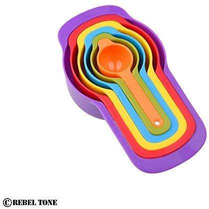 Set of 6 colorful measuring cups and spoons that can be nested to save space. 6 sizes: 1/2 Tbls, 1 Tbls, 1/4 cup, 1/3 cup, 1/2 cup, 1 cup. For...