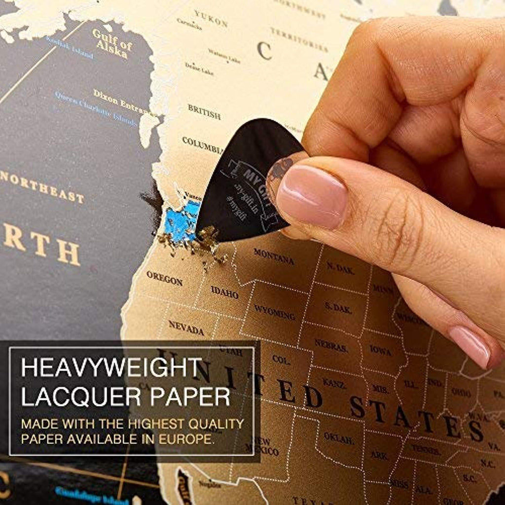 MyMap Gold Scratch Off World Map Wall Poster with US States, 35x25 inches, Includes Pins, Buttons and Scratcher, Glossy Finish, Black with Vibrant Colors