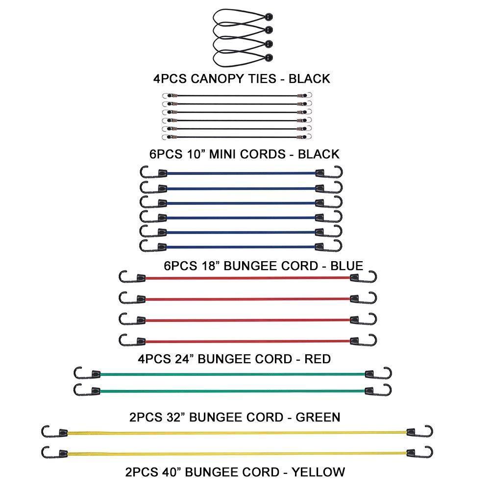 NoOne bungee cords are UV resistant and can withstand the harshest outdoor elements, these premium quality cords boast a 100% latex core that will retain its superior elasticity for longer without deteriorating, plastic steel core hook(all bungee cords longer than 10'') - to prevent scratches and damage to your cars or other belongings.