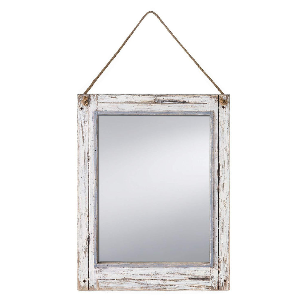 Mirror with distressed wood frame Rope hanger for easy wall hanging Overall Size 15" x 19"