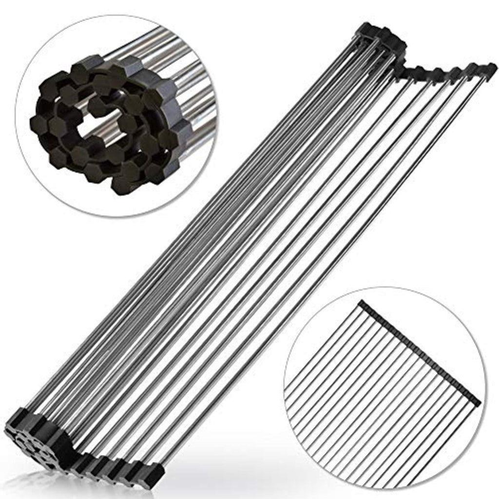 Roll-Up Dish Drying Rack 20"(L) x 16"(W) (50 x 40cm) - Foldable Multipurpose Heat Resistant Large Stainless Steel Kitchen Rollup Dish Drainer Over Sink Mat - Silicone Coated Rims