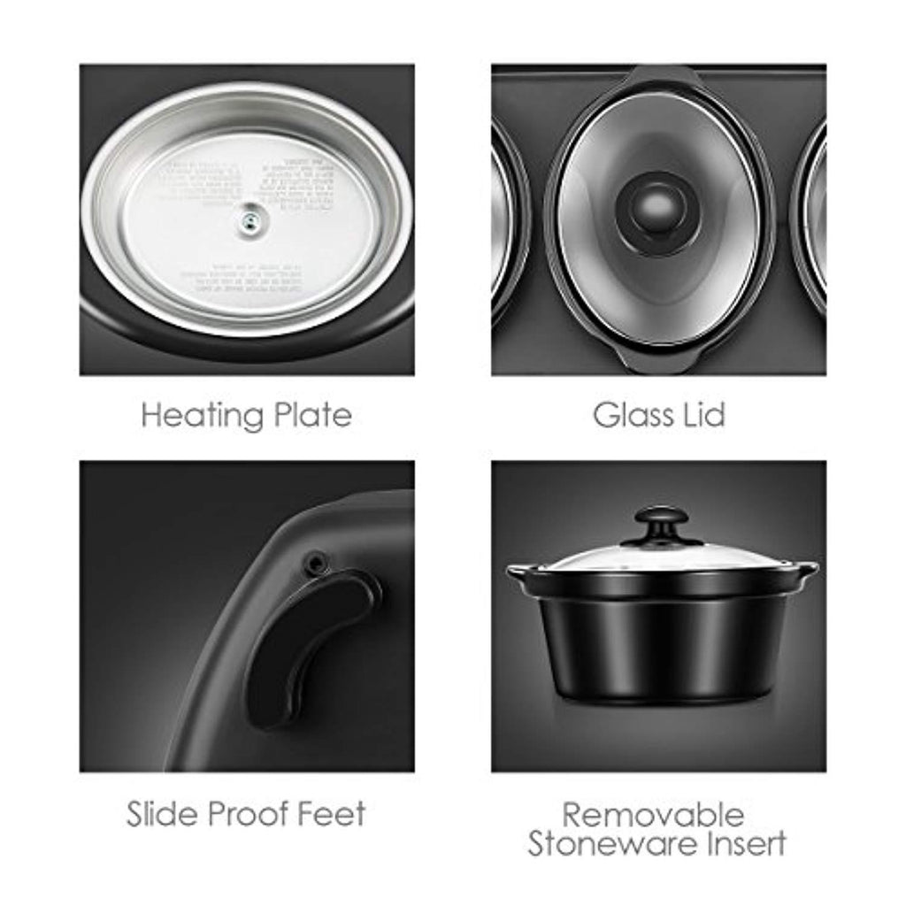 Three removable 1.5Qt stoneware inserts and powered at 270 Watts Independently Temperature Controls with Low, High and Warm settings Cool Touch Handle for convenient and safely serving and transporting Dishwasher...