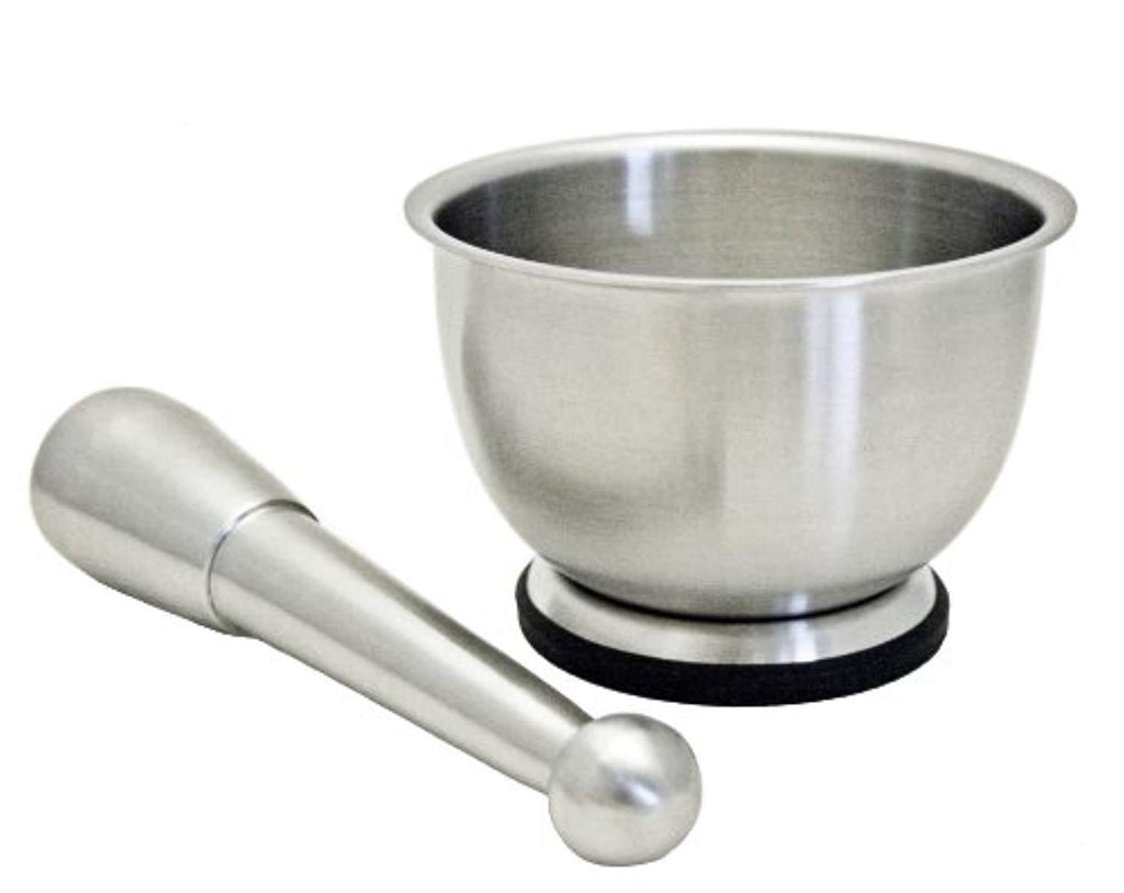 Functional design mortar with deeper volume and non-skid base, heavy-duty perfectly-balanced pestle press Quality 18/8 stainless steel, contemporary brushed finish, functional design and fine craftsmanship Mortar diameter 4.8 x H...