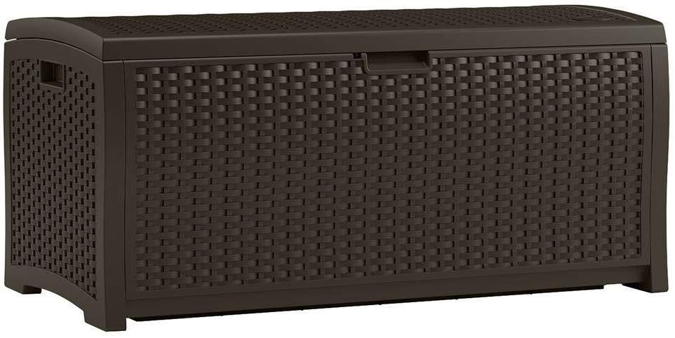 Suncast 73-Gallon Medium Deck Box - Lightweight Resin Indoor/Outdoor Storage Container and Seat for Patio Cushions, Gardening Tools and Toys - Store Items on Patio, Garage, Yard - Mocha Brown