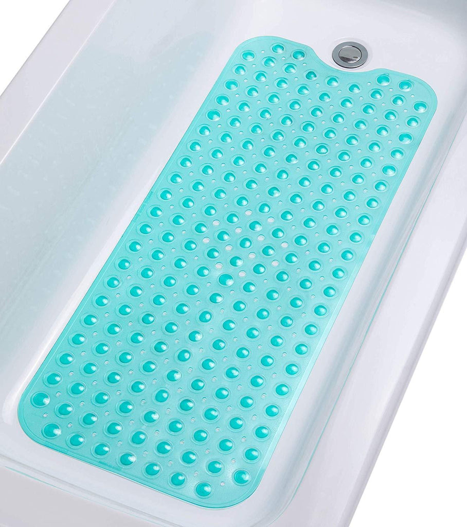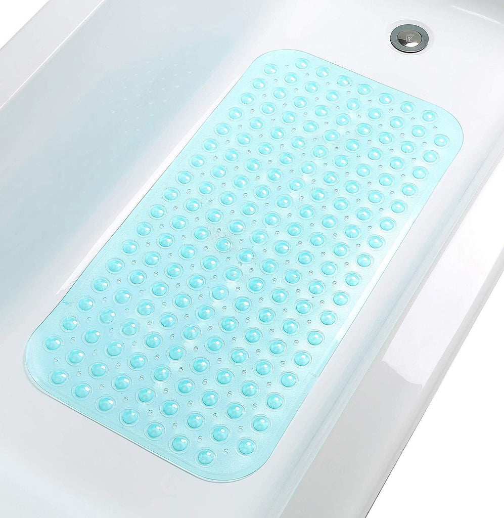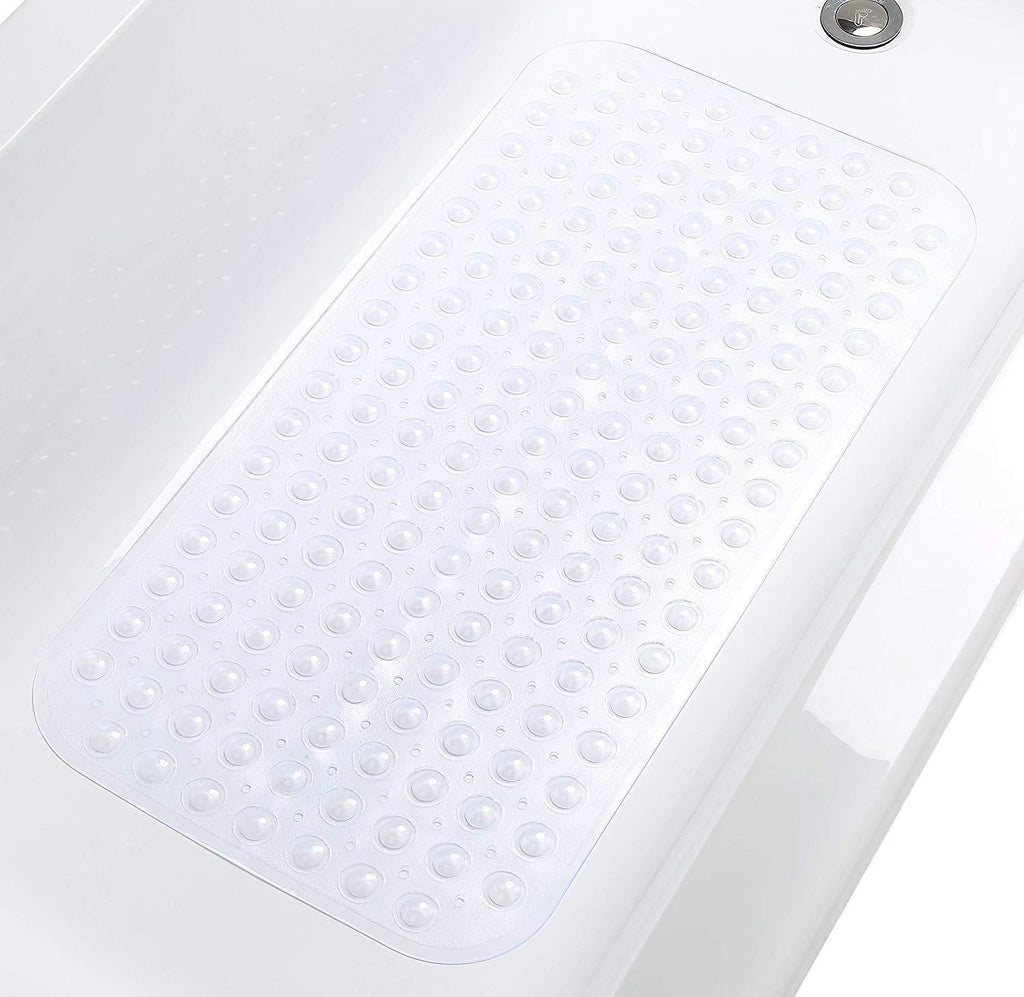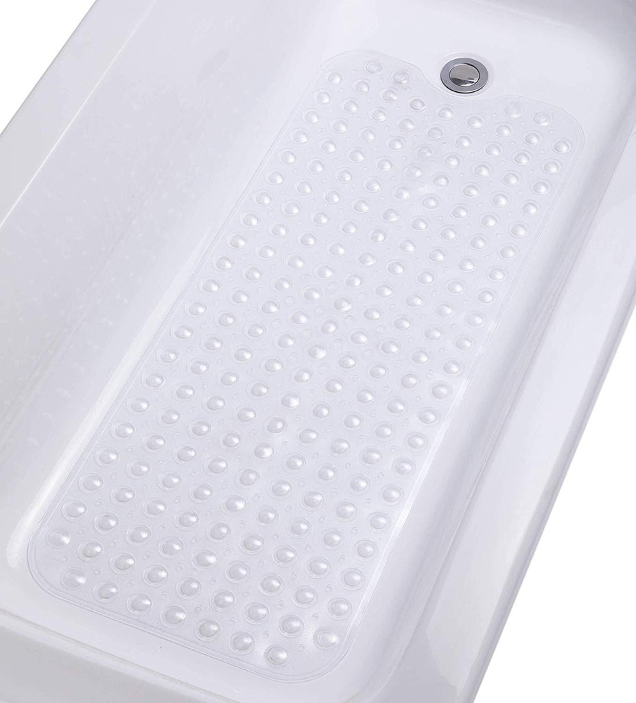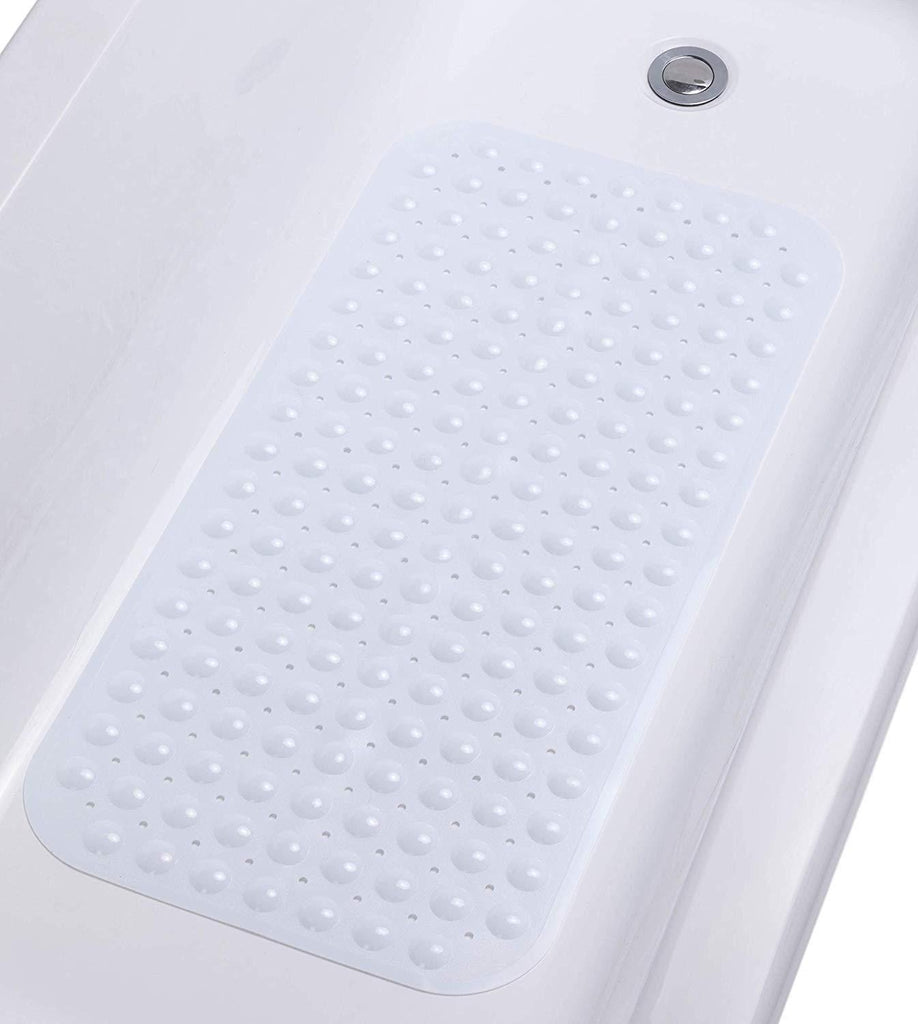 • BEST MATERIALS: Highest quality phthalate-free, BPA-free allergen-free vinyl. Heavy duty, weighing in at 1.75 lbs., it lays flat and won’t slip on the tub or shower floor. Curl-free packaging makes this extra long bath mat easy to use starting day 1. Stronger than rubber bathtub mats, cleaner than bath rugs, best of the non-slip bath mats on the market!