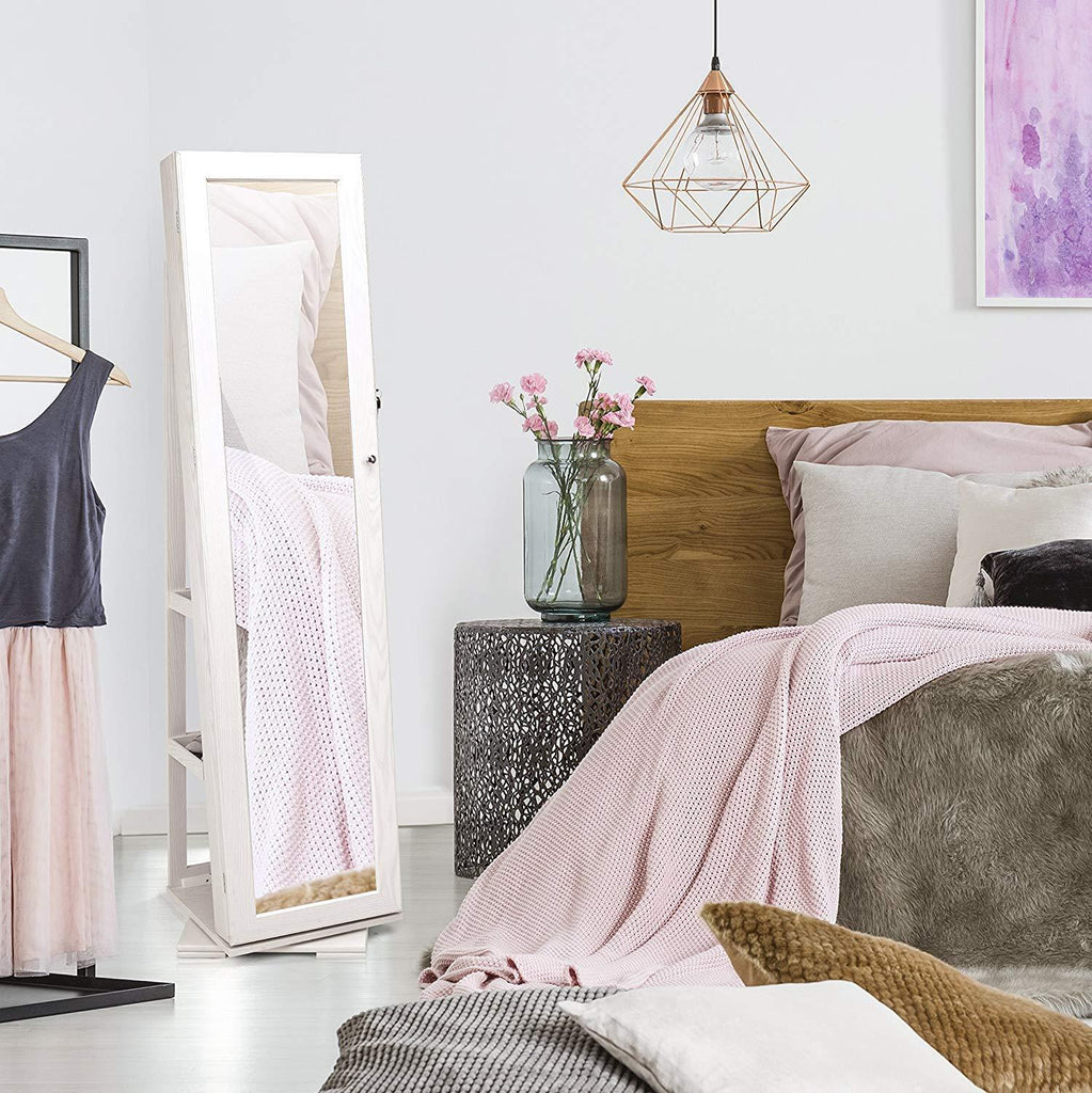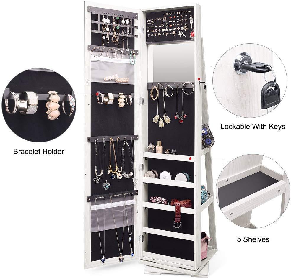 TWING Jewelry Organizer Jewelry Cabinet 360 Rotating, Lockable Standing Wall Jewelry Armoire with Full Length Mirror Large Jewelry Armoire Cabinet(White with Wood Grain)