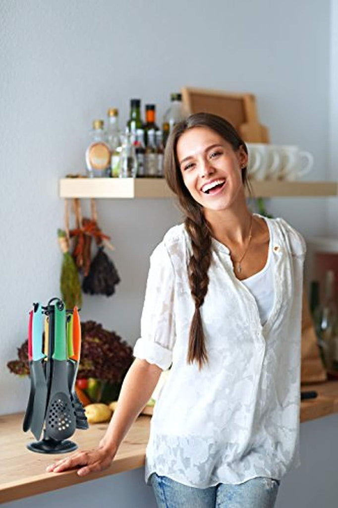 Utensils Set, 7-piece Nylon Cooking & Serving Kitchen Tools inc. Organizing 360° Rotating Stand, Kitchen Accessories Gadgets - Spatula, Turner, Ladle, Spaghetti Server, Slotted & Solid Spoon